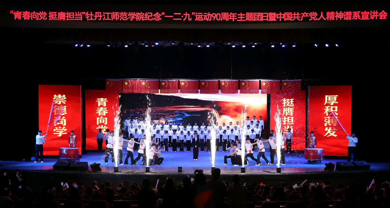 为深入学习贯彻党的二十届四中全会精神,引领团员青年坚定理想信念,表彰团内先优,12月3日晚,学校在第一音乐厅“举行青春向党挺膺担当——牡丹江师范学院纪念一二·九运动90周年主题团日暨中国共产党人精神谱系宣讲会”。学校领导王志浩、丛喜权、刘松、陈海萍、张艳霞、张晓祥、孙伯勇、左明辉、贲利、刘恒文出席大会。