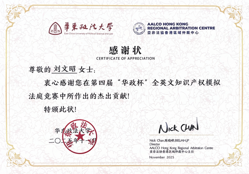 同期,在华东政法大学举办的第四届"华政杯"知识产权模拟法庭竞赛中,由我校法学院姜欣彤、李孜瑜、钱思怡、邰玺羽四位学生组成的代表队,在刘文昭老师的指导下荣获"优秀奖",刘文昭老师获得"感谢状"。