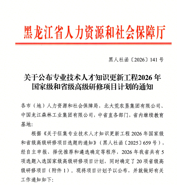 近日,黑龙江省人力资源和社会保障厅正式印发《关于公布专业技术人才知识更新工程2026年国家级和省级高级研修项目计划的通知》。我校申报的《区域国别法学与涉外商事法治》项目成功获批2026年省级高级研修项目,成为省级高级研修项目二十项之一,是我校作为黑龙江省专业技术人员继续教育基地取得的一次重大突破。