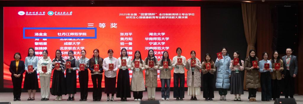 近日,2025年全国“田家炳杯”全日制教学硕士专业学位研究生心理健康教育专业教学技能大赛决赛在东北师范大学圆满收官。教育科学学院心理健康教育专业研究生汤金金荣获三等奖。