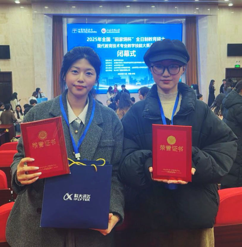 近日,全国“田家炳杯”全日制教育硕士专业学位研究生现代教育技术专业教学技能大赛决赛在山东师范大学圆满落幕,我校计算机与信息技术学院2024级研究生周子诗、张菽杭分别荣获全国总决赛二等奖、三等奖,刘凤艳老师荣获优秀指导教师奖。