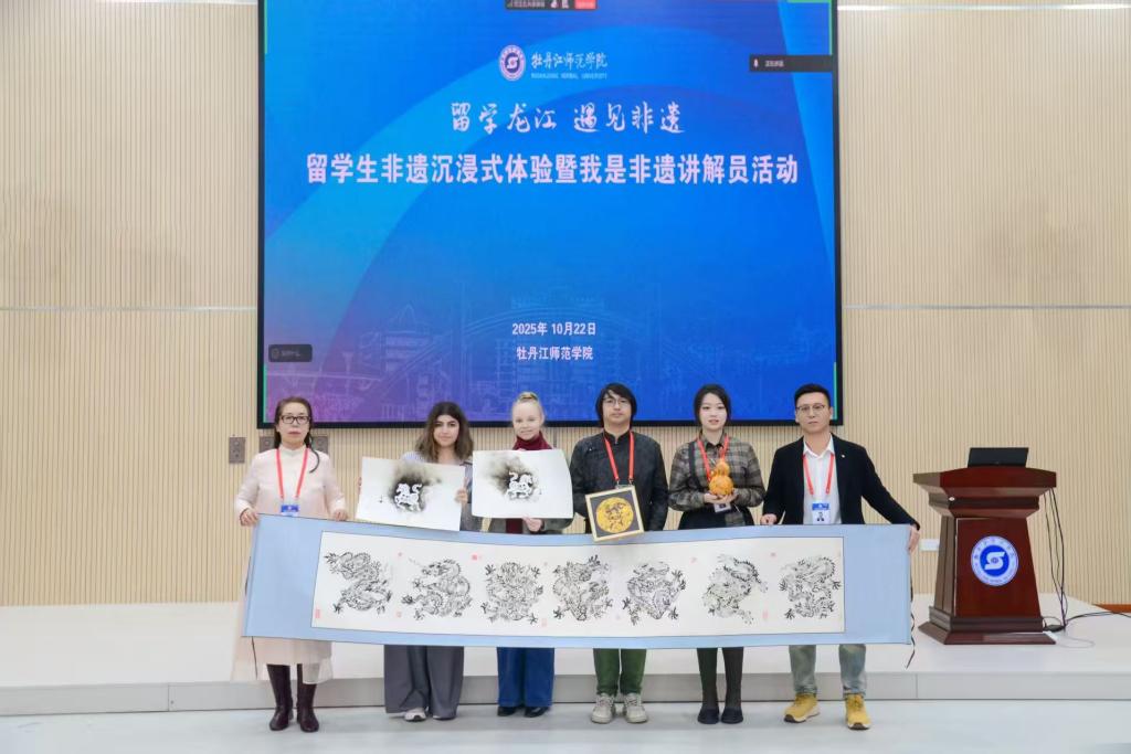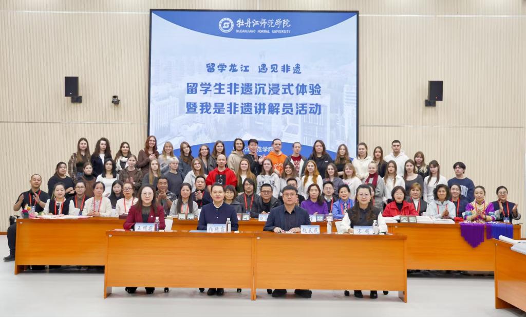 张艳霞在会上致辞。她代表学校向远道而来的留学生、全省各地的非遗传承人致以最热烈的欢迎,介绍了学校留学生教育的发展成果与非物质文化遗产教育研究基地的建设情况,着重强调文化交流是促进文明互鉴的重要纽带。同时,她寄语留学生以牡丹江师范学院“文化大使”的身份,用开放心态体悟中国文化的深厚底蕴,以创新思维探索传统与现代的结合。
