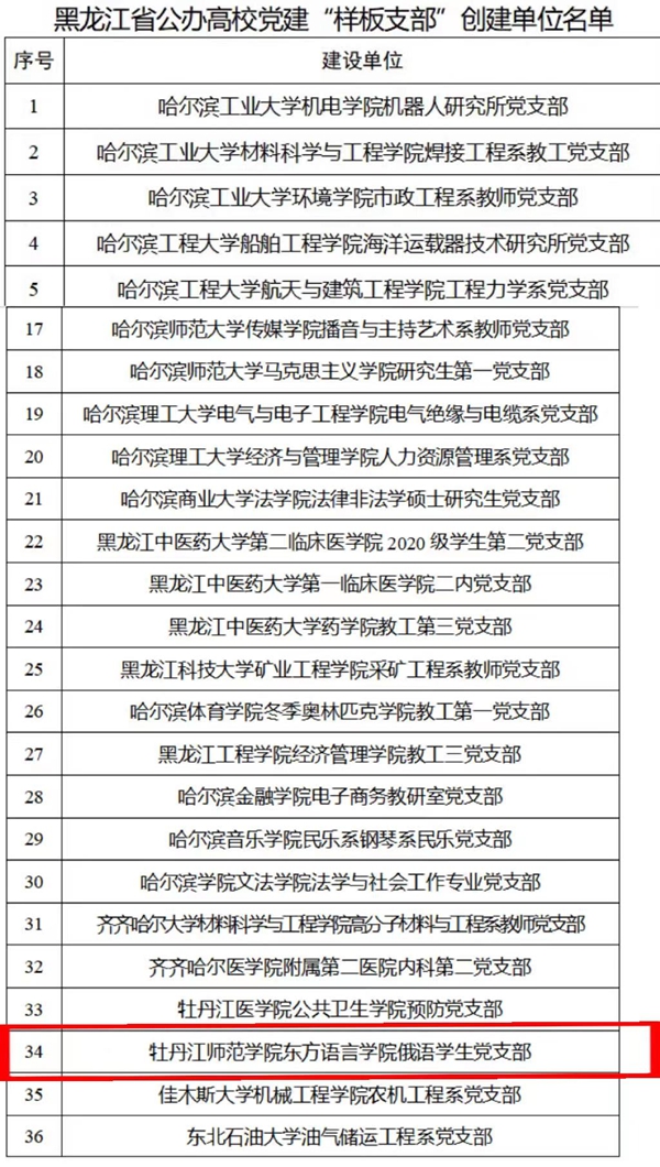 近日,省委教育工委正式发布《关于公布黑龙江省公办高校党建“示范创建”名单的通知》(黑教工委函〔2023〕1号),牡丹江师范学院东方语言学院俄语学生党支部入选黑龙江省公办高校党建“样板支部”创建单位。学校党委高度重视党建“示范创建”培育和建设工作,按照《中共教育部党组关于高校党组织“对标争先”建设计划的实施意见》(教党〔2018〕25号)和《第三批新时代高校党建“双创”工作重点任务指南》的规定和要求,发布《...