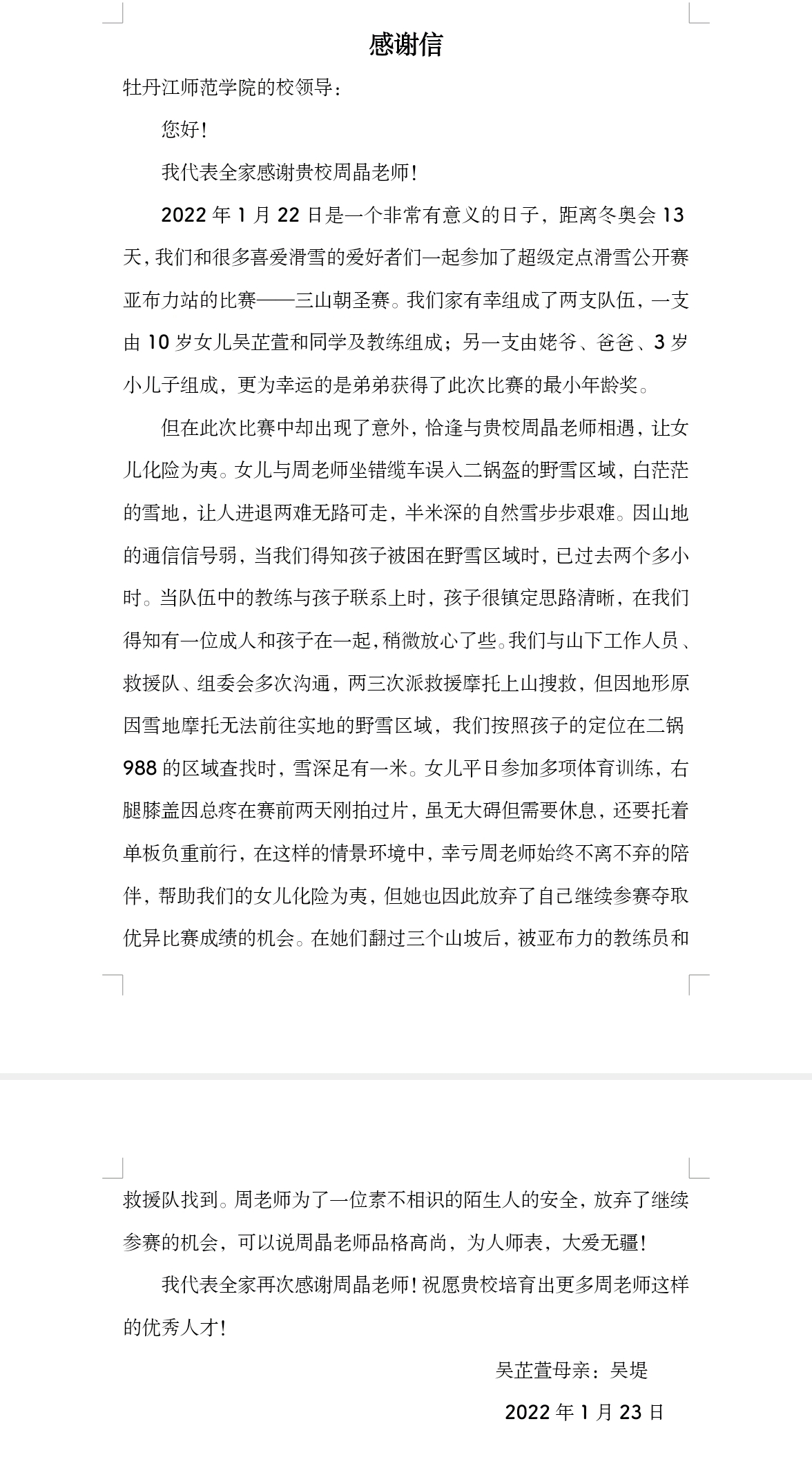 “由衷地感谢周晶老师,感谢周老师为了一位素不相识的陌生人的安全,放弃了继续参赛的机会,周晶老师品格高尚、为人师表、大爱无疆……”1月25日,学校收到了一封饱含深情的对我校经济与管理学院辅导员周晶的感谢信